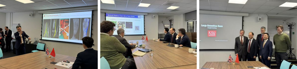 During research exchanges, the delegation introduced the hospital’s representative achievements in ultrasound medical–engineering integration, including radiation-free ultrasound tomography, visualized acupuncture research, wearable ultrasound devices applied in the China Space Station program, and transcranial ultrasound technologies for neurological diseases. These achievements were highly recognized by the King’s team.